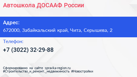 Автошкола, ДОСААФ России по адресу 672000, Забайкальский край, Чита, Серышева, 2 в дальнейшем Организация, размещена в следующих категориях: