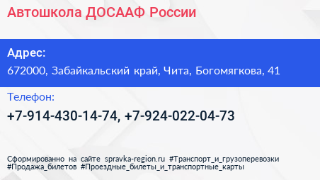 Автошкола, ДОСААФ России по адресу 672000, Забайкальский край, Чита, Богомягкова, 41 в дальнейшем Организация, размещена в следующих категориях: