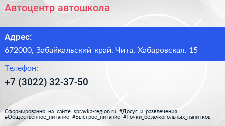 Автоцентр, автошкола по адресу 672000, Забайкальский край, Чита, Хабаровская, 15 в дальнейшем Организация, размещена в следующих категориях: