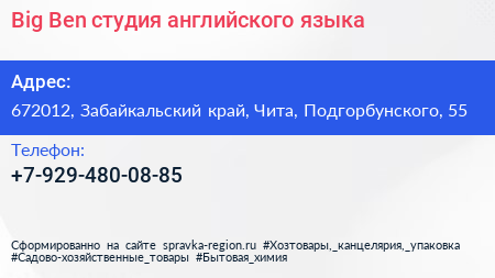 Big Ben, студия английского языка по адресу 672012, Забайкальский край, Чита, Подгорбунского, 55 в дальнейшем Организация, размещена в следующих категориях: