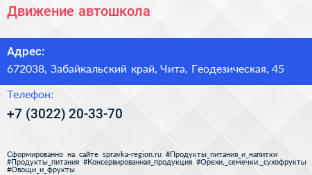 Движение, автошкола по адресу 672038, Забайкальский край, Чита, Геодезическая, 45 в дальнейшем Организация, размещена в следующих категориях: