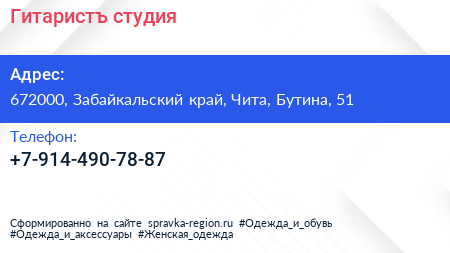 Гитаристъ, студия по адресу 672000, Забайкальский край, Чита, Бутина, 51 в дальнейшем Организация, размещена в следующих категориях: