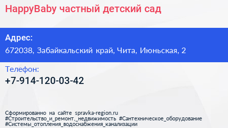 HappyBaby, частный детский сад по адресу 672038, Забайкальский край, Чита, Июньская, 2 в дальнейшем Организация, размещена в следующих категориях: