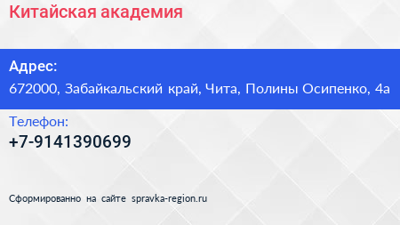 Китайская академия по адресу 672000, Забайкальский край, Чита, Полины Осипенко, 4а в дальнейшем Организация, размещена в следующих категориях: