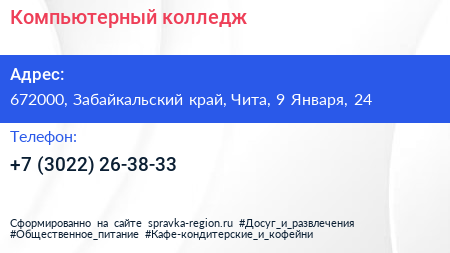 Компьютерный колледж по адресу 672000, Забайкальский край, Чита, 9 Января, 24 в дальнейшем Организация, размещена в следующих категориях: