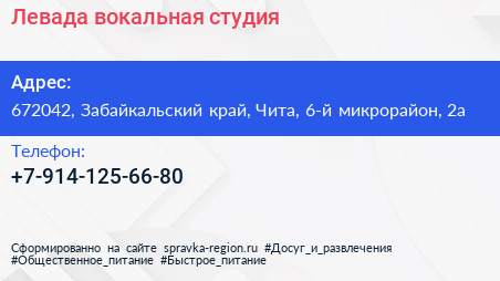 Левада, вокальная студия по адресу 672042, Забайкальский край, Чита, 6-й микрорайон, 2а в дальнейшем Организация, размещена в следующих категориях: