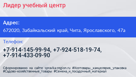 Лидер, учебный центр по адресу 672020, Забайкальский край, Чита, Ярославского, 47а в дальнейшем Организация, размещена в следующих категориях: