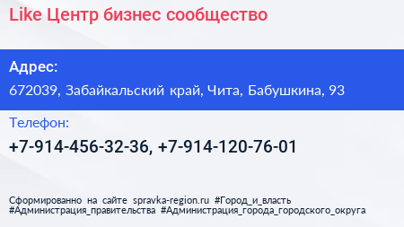 Like Центр, бизнес-сообщество по адресу 672039, Забайкальский край, Чита, Бабушкина, 93 в дальнейшем Организация, размещена в следующих категориях: