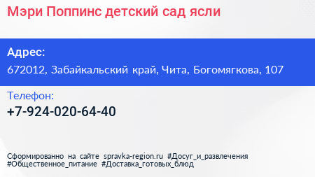 Мэри Поппинс, детский сад-ясли по адресу 672012, Забайкальский край, Чита, Богомягкова, 107 в дальнейшем Организация, размещена в следующих категориях: