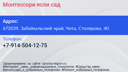 Монтессори ясли-сад по адресу 672039, Забайкальский край, Чита, Столярова, 40 в дальнейшем Организация, размещена в следующих категориях: