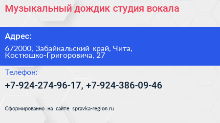 Музыкальный дождик, студия вокала по адресу 672000, Забайкальский край, Чита, Костюшко-Григоровича, 27 в дальнейшем Организация, размещена в следующих категориях: