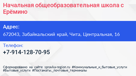 Начальная общеобразовательная школа, с. Ерёмино по адресу 672043, Забайкальский край, Чита, Центральная, 16 в дальнейшем Организация, размещена в следующих категориях: