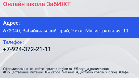 Онлайн-школа, ЗабИЖТ по адресу 672040, Забайкальский край, Чита, Магистральная, 11 в дальнейшем Организация, размещена в следующих категориях: