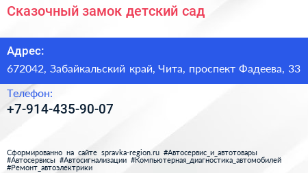 Сказочный замок, детский сад по адресу 672042, Забайкальский край, Чита, проспект Фадеева, 33 в дальнейшем Организация, размещена в следующих категориях:
