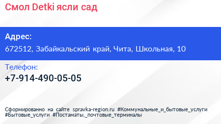 Смол.Detki, ясли-сад по адресу 672512, Забайкальский край, Чита, Школьная, 10 в дальнейшем Организация, размещена в следующих категориях: