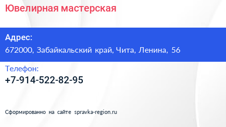 Ювелирная мастерская по адресу 672000, Забайкальский край, Чита, Ленина, 56 в дальнейшем Организация, размещена в следующих категориях: