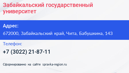 Забайкальский государственный университет по адресу 672000, Забайкальский край, Чита, Бабушкина, 143 в дальнейшем Организация, размещена в следующих категориях: