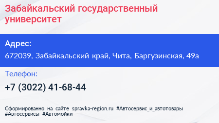 Забайкальский государственный университет по адресу 672039, Забайкальский край, Чита, Баргузинская, 49а в дальнейшем Организация, размещена в следующих категориях: