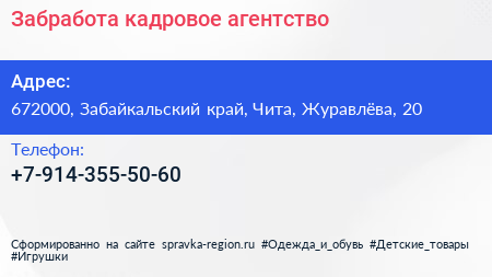 Забработа, кадровое агентство по адресу 672000, Забайкальский край, Чита, Журавлёва, 20 в дальнейшем Организация, размещена в следующих категориях: