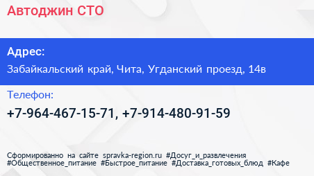 Автоджин, СТО по адресу Забайкальский край, Чита, Угданский проезд, 14в в дальнейшем Организация, размещена в следующих категориях: