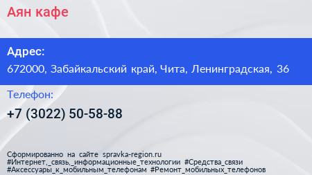 Аян, кафе по адресу 672000, Забайкальский край, Чита, Ленинградская, 36 в дальнейшем Организация, размещена в следующих категориях: