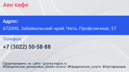 Аян, кафе по адресу 672000, Забайкальский край, Чита, Профсоюзная, 17 в дальнейшем Организация, размещена в следующих категориях: