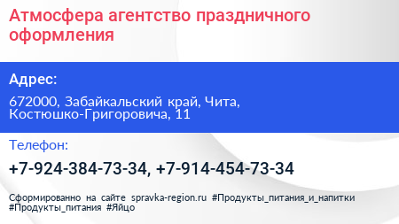Атмосфера, агентство праздничного оформления по адресу 672000, Забайкальский край, Чита, Костюшко-Григоровича, 11 в дальнейшем Организация, размещена в следующих категориях: