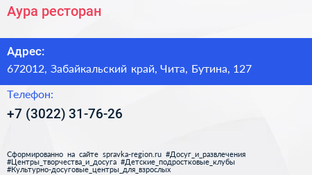 Аура, ресторан по адресу 672012, Забайкальский край, Чита, Бутина, 127 в дальнейшем Организация, размещена в следующих категориях: