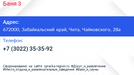 Баня №3 по адресу 672000, Забайкальский край, Чита, Чайковского, 28а в дальнейшем Организация, размещена в следующих категориях: