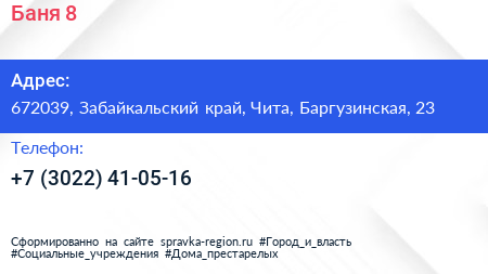 Баня №8 по адресу 672039, Забайкальский край, Чита, Баргузинская, 23 в дальнейшем Организация, размещена в следующих категориях: