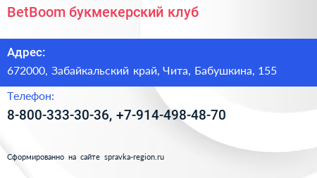 BetBoom, букмекерский клуб по адресу 672000, Забайкальский край, Чита, Бабушкина, 155 в дальнейшем Организация, размещена в следующих категориях: