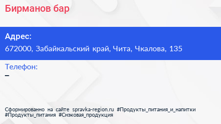 Бирманов, бар по адресу 672000, Забайкальский край, Чита, Чкалова, 135 в дальнейшем Организация, размещена в следующих категориях: