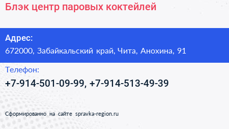 Блэк, центр паровых коктейлей по адресу 672000, Забайкальский край, Чита, Анохина, 91 в дальнейшем Организация, размещена в следующих категориях: