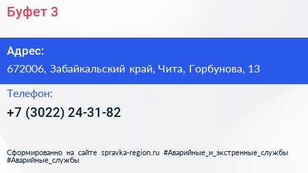 Буфет №3 по адресу 672006, Забайкальский край, Чита, Горбунова, 13 в дальнейшем Организация, размещена в следующих категориях: