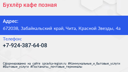 Бухлёр, кафе-позная по адресу 672038, Забайкальский край, Чита, Красной Звезды, 4а в дальнейшем Организация, размещена в следующих категориях: