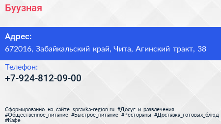 Буузная по адресу 672016, Забайкальский край, Чита, Агинский тракт, 38 в дальнейшем Организация, размещена в следующих категориях: