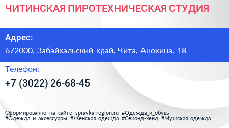 ЧИТИНСКАЯ ПИРОТЕХНИЧЕСКАЯ СТУДИЯ по адресу 672000, Забайкальский край, Чита, Анохина, 18 в дальнейшем Организация, размещена в следующих категориях: