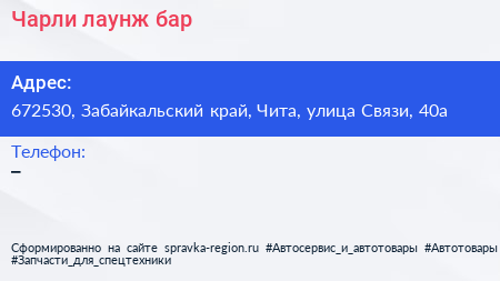 Чарли, лаунж-бар по адресу 672530, Забайкальский край, Чита, улица Связи, 40а в дальнейшем Организация, размещена в следующих категориях: