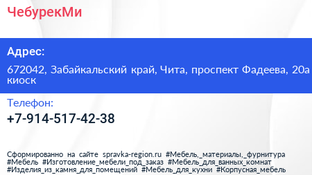 ЧебурекМи по адресу 672042, Забайкальский край, Чита, проспект Фадеева, 20а киоск в дальнейшем Организация, размещена в следующих категориях:
