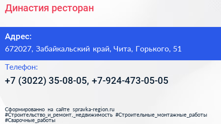 Династия, ресторан по адресу 672027, Забайкальский край, Чита, Горького, 51 в дальнейшем Организация, размещена в следующих категориях: