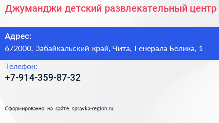 Джуманджи, детский развлекательный центр по адресу 672000, Забайкальский край, Чита, Генерала Белика, 1 в дальнейшем Организация, размещена в следующих категориях: