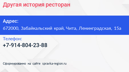 Другая история, ресторан по адресу 672000, Забайкальский край, Чита, Ленинградская, 15а в дальнейшем Организация, размещена в следующих категориях: