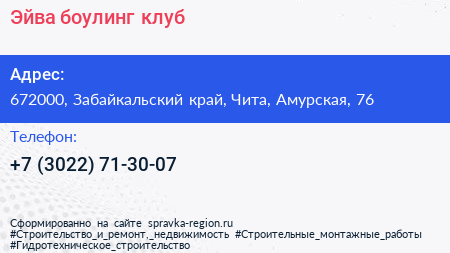 Эйва, боулинг-клуб по адресу 672000, Забайкальский край, Чита, Амурская, 76 в дальнейшем Организация, размещена в следующих категориях: