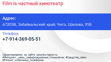 Film is, частный кинотеатр по адресу 672038, Забайкальский край, Чита, Шилова, 95Б в дальнейшем Организация, размещена в следующих категориях: