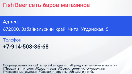 Fish & Beer, сеть баров-магазинов по адресу 672000, Забайкальский край, Чита, Угданская, 5 в дальнейшем Организация, размещена в следующих категориях: