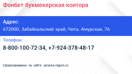 Фонбет, букмекерская контора по адресу 672000, Забайкальский край, Чита, Амурская, 76 в дальнейшем Организация, размещена в следующих категориях: