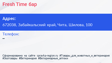 Fresh Time, бар по адресу 672038, Забайкальский край, Чита, Шилова, 100 в дальнейшем Организация, размещена в следующих категориях: