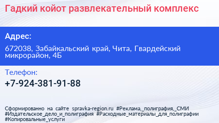 Гадкий койот, развлекательный комплекс по адресу 672038, Забайкальский край, Чита, Гвардейский микрорайон, 4Б в дальнейшем Организация, размещена в следующих категориях: