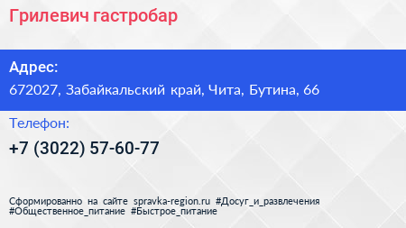 Грилевич, гастробар по адресу 672027, Забайкальский край, Чита, Бутина, 66 в дальнейшем Организация, размещена в следующих категориях: