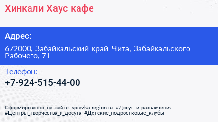 Хинкали Хаус, кафе по адресу 672000, Забайкальский край, Чита, Забайкальского Рабочего, 71 в дальнейшем Организация, размещена в следующих категориях: